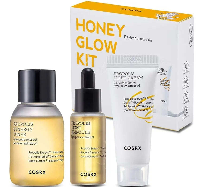 Three products, one purpose: skin that catches light. The COSRX Honey Glow Kit pairs a toner, ampoule, and cream — each infused with propolis, honey, and royal jelly — to build moisture layers without stickiness.
