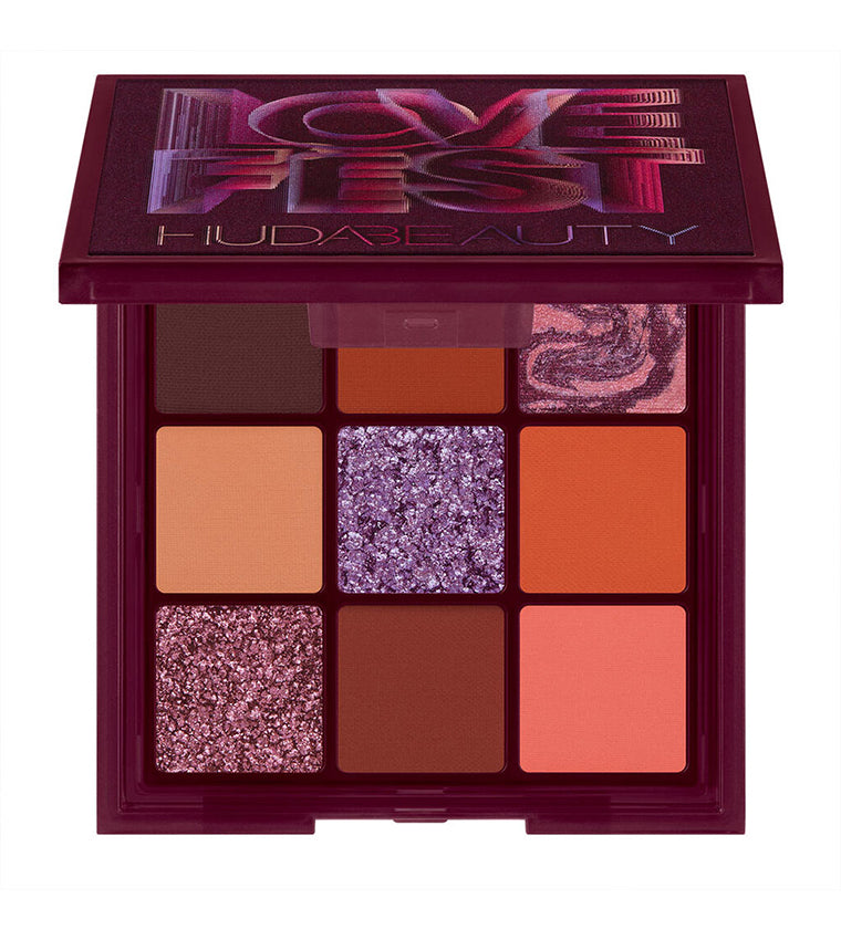 Compact but bold. Huda Beauty’s Lovefest Obsessions Palette (7.02g) packs warm terracotta mattes, nude mattes, and dual-toned marbled shimmers that build from a wash to a foiled finish.
