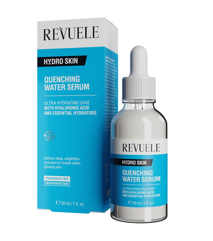 Revuele Hydro Skin Quenching Serum Water is a hyaluronic acid-driven formula that floods skin with moisture without heaviness. The water-light texture absorbs instantly, plumping fine lines and restoring suppleness.